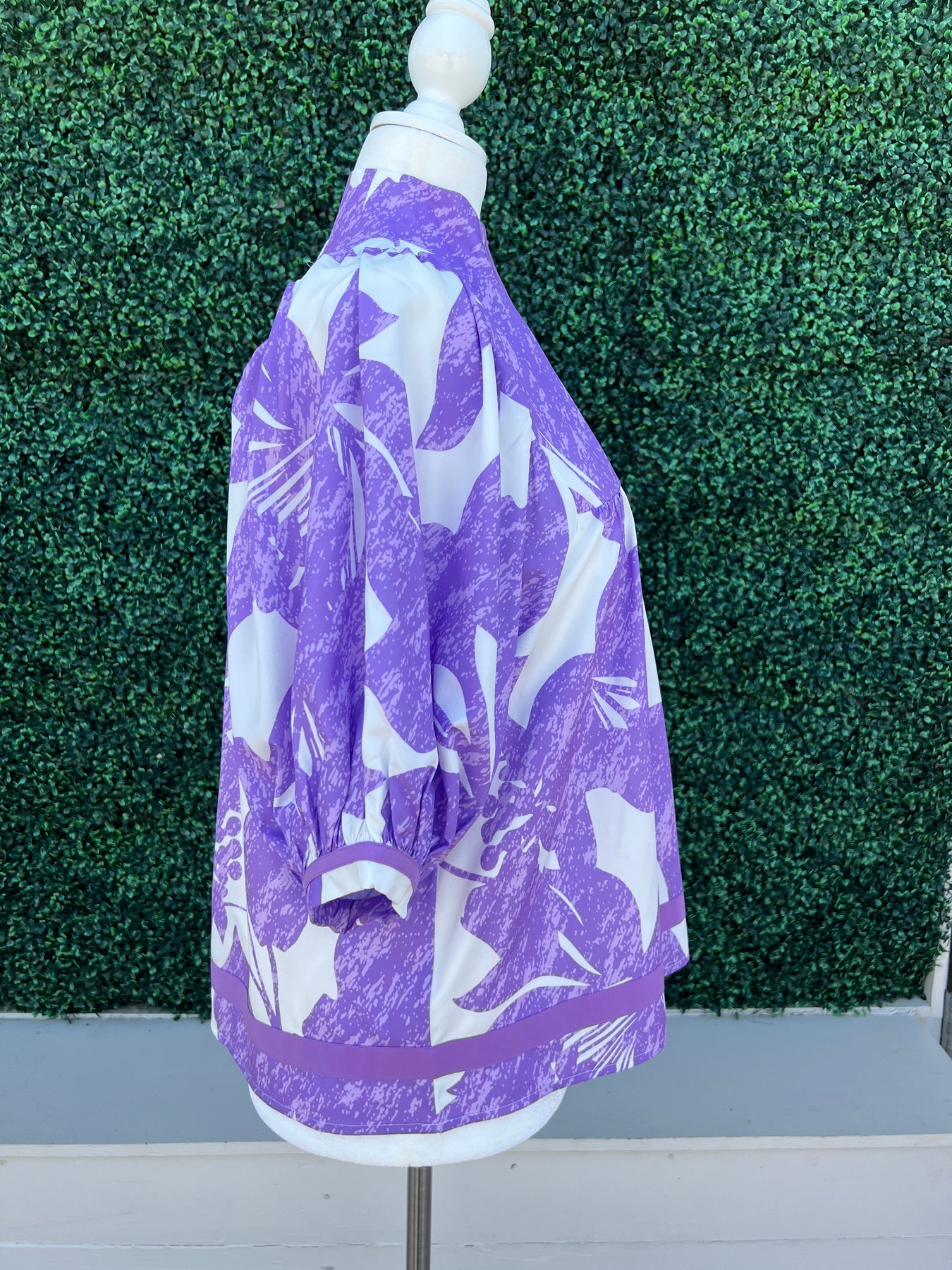 Be spring-ready in this playful Purple Abstract Floral Blouse! The puff short sleeves add a touch of whimsy, while the vibrant purple ribbon trim and abstract pattern make a statement. Perfect for any occasion, this V-neck top is sure to be a staple in your wardrobe!